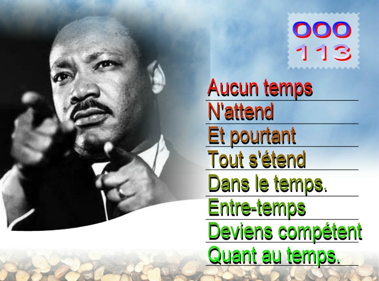Aucun temps N'attend Et pourtant Tout s'étend Dans le temps. Entre-temps Deviens compétent Quant au temps.