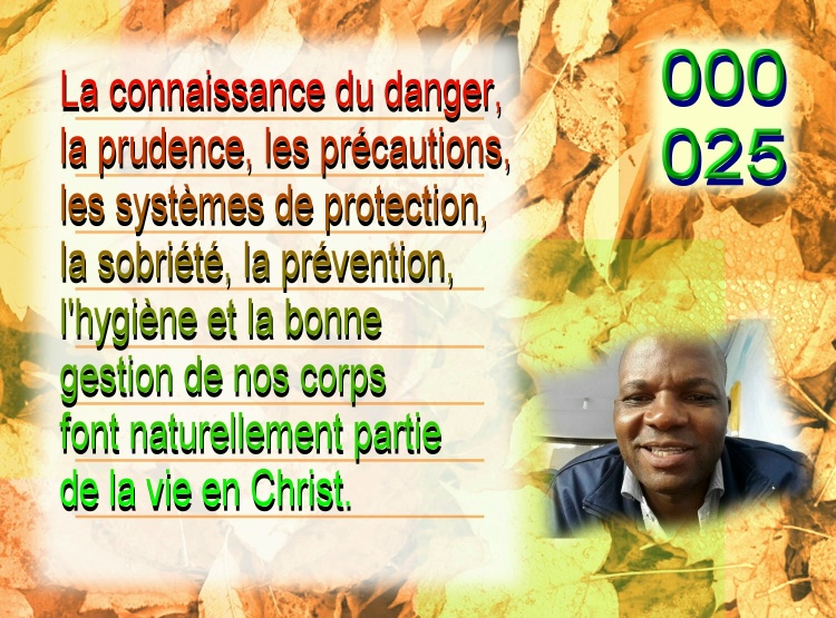 La connaissance du danger, la prudence, les précautions, les systèmes de protection, la sobriété, la prévention, l'hygiène et la bonne gestion de nos corps font naturellement partie de la vie en Christ. Les chrétiens qui pensent en être dispensés à cause de leur foi ou qui accusent d'incrédulité ceux qui prennent des mesures légitimes de sécurité, s'explosent à bien des périls. Ils ont un corps terreste, mais vivent comme s'ils avaient déjà leur corps célestre!