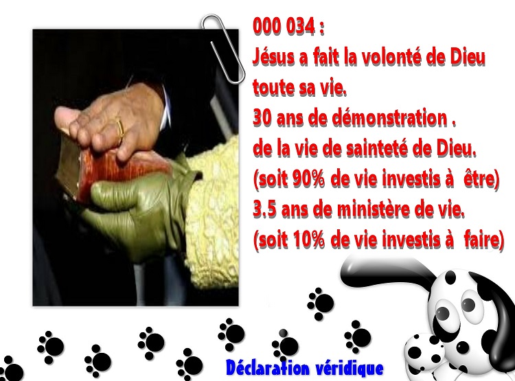 Jésus a fait la volonté de Dieu toute sa vie. 30 ans de démonstration de la vie de sainteté de Dieu. (soit 90% de vie investis à être) 3.5 ans de ministère de vie. (soit 10% de vie investis à faire)